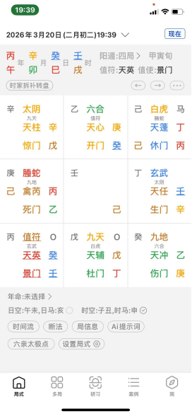 四是看是否被传唤,看年命落宫状态,天盘年命己在震宫,寄丙,丙是太岁,与官方的人在一起,临死门,动不了。地盘年命己落坤宫,己土击刑,临白虎。死门,白虎,己未男被传唤了。传唤后看辛,辛在巽宫,辛下戊子午相冲,关不住,会被钱冲出来,也就是取保候审。